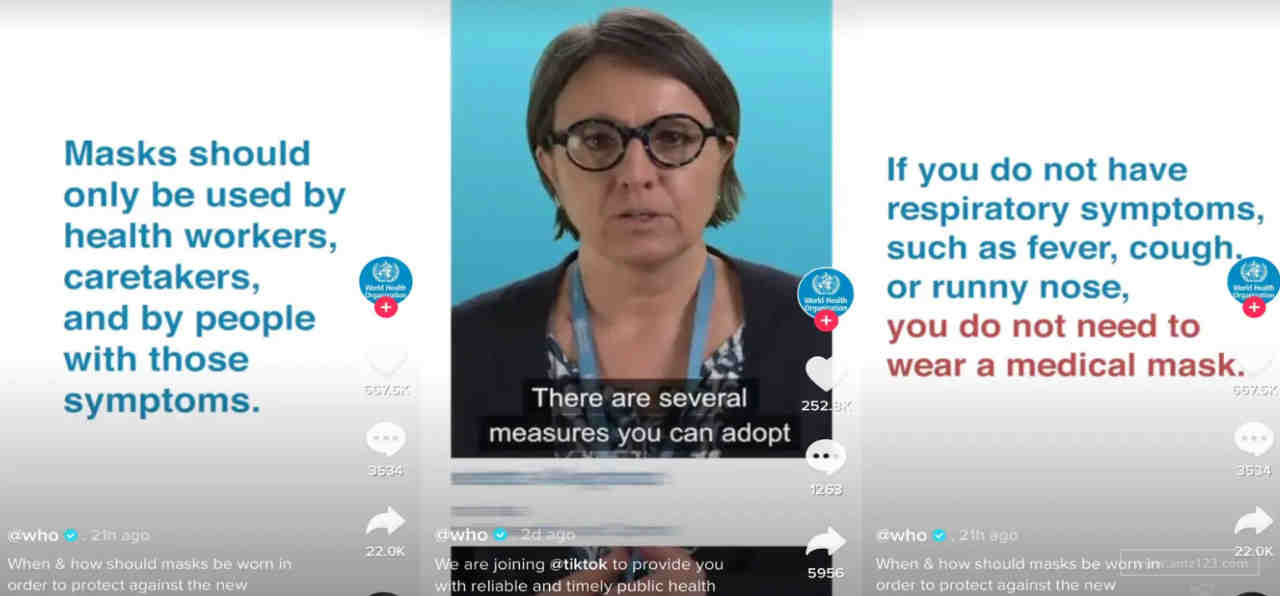 世界卫生组织(WHO / World Health Organization)还利用其认证的TikTok账户分享视频,这些视频提供了围绕COVID-19危机事件的最近进展,使其能够与该应用的年轻受众群建立联系。