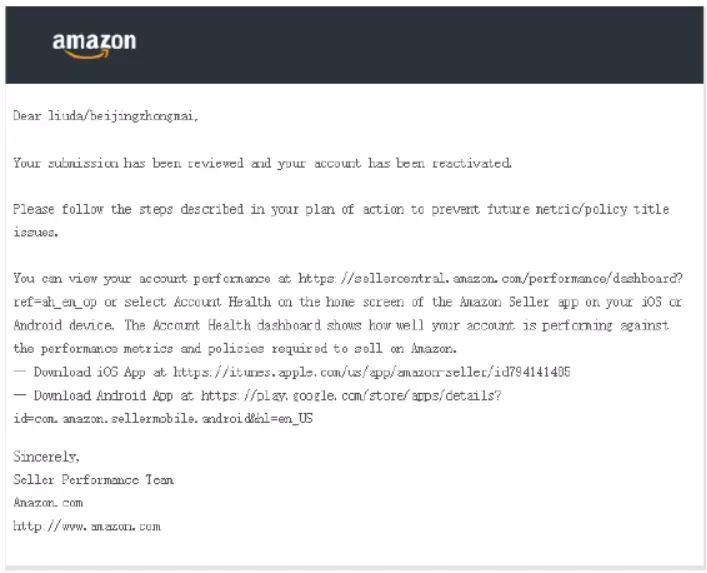 邮件标题通常是:Your selling on Amazon account has been reinstated.