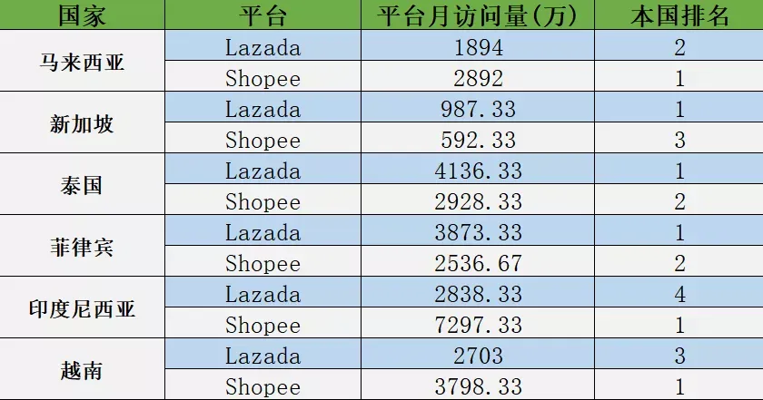 总体来看 Lazada&Shopee地位无可撼动 根据数据显示,在月访问量方面,Shopee依旧是东南亚电商平台中的“霸主”,达到2亿人次; 其次是作为成立时间远早于Shopee的平台Lazada,屈居第二,月访问量1.6亿人次; 就各国来说: Lazada平台中月访问量较高的为泰国、菲律宾和新加坡,占据3国电商平台的头把交椅; Shopee则在印度尼西亚、马来西亚和越南更胜一筹; 本土电商发展也不容忽视 在印度尼西亚,本土电商平台Tokopedia和Bukalapak分别占据第二和第三的位置; 在越南,Sendo依旧排名第二,之前排名第三的Tiki被Lazada反超,排名第四; 在新加坡,排名第二的电商平台为Qoo10,访问量远超Shopee SG。 不过,截至目前,仍未有两家平台GMV的最新数据。 4季度各国电商平台排名如下 (马来西亚) (新加坡) (泰国) (菲律宾) (印度尼西亚) (越南)