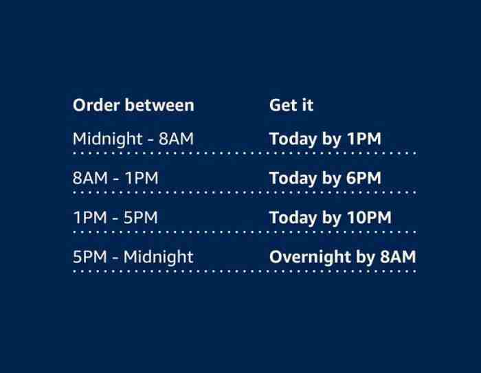 不过并不是所有的商品都能享受到新的更快当日达服务。亚马逊提到,标有“Today by”的商品在服务范围内,这些商品目前的数量已经有300多万件。当然,消费者也可以在午夜之前订购然后选择“晚上8点前”的送货方式,然后在第二天早上收到货。如果想让隔夜送达,那么送货员会在早上4点半到8点之间到达。