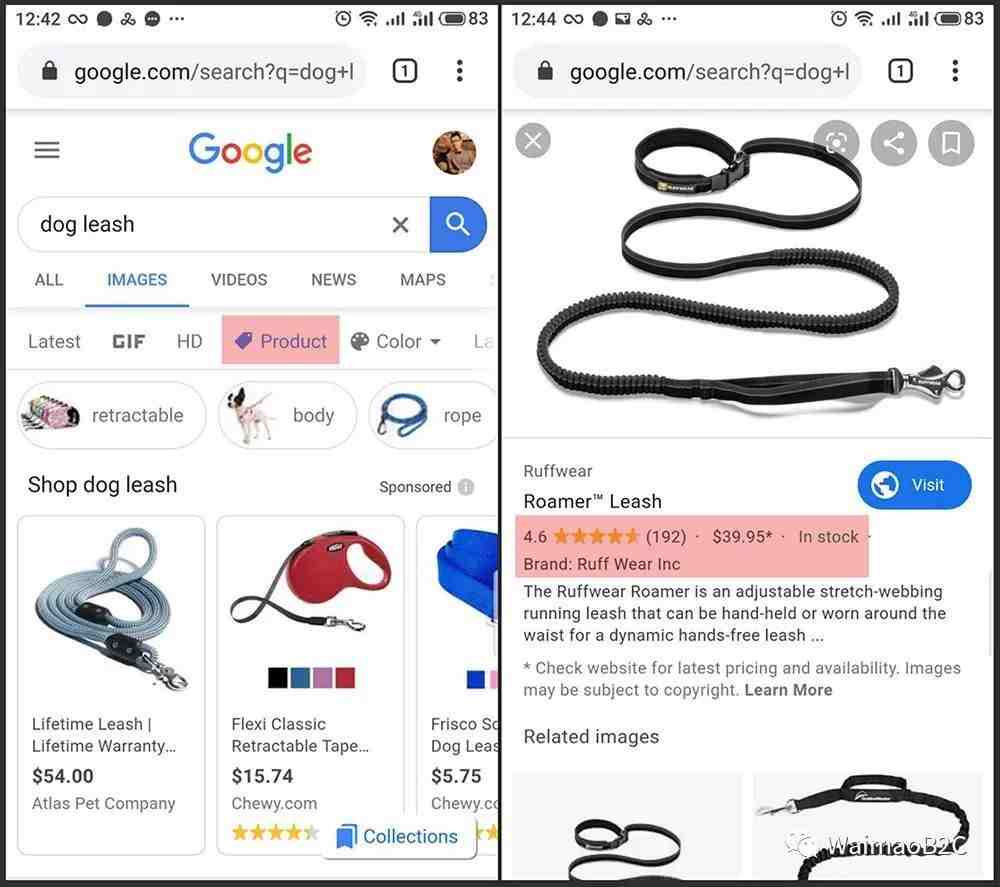 而在移动端,Google Image 显示的内容则要更丰富,更有号召力一些。如下图所示,在搜索结果页面,Images 的筛选条件中有 Product 可以选择,也就是客户搜索某类关键词之后,可以点击“Product”标签,只看可以购买的所有产品图片。点击某个图片之后展示的信息和PC端一样会展示富媒体内容,如标题,描述,价格,品牌,评价,库存等等信息,而且,更重要的是有一个“Call to Action” 按钮 “Visit” 引导客户点击到网站页面进行购买。