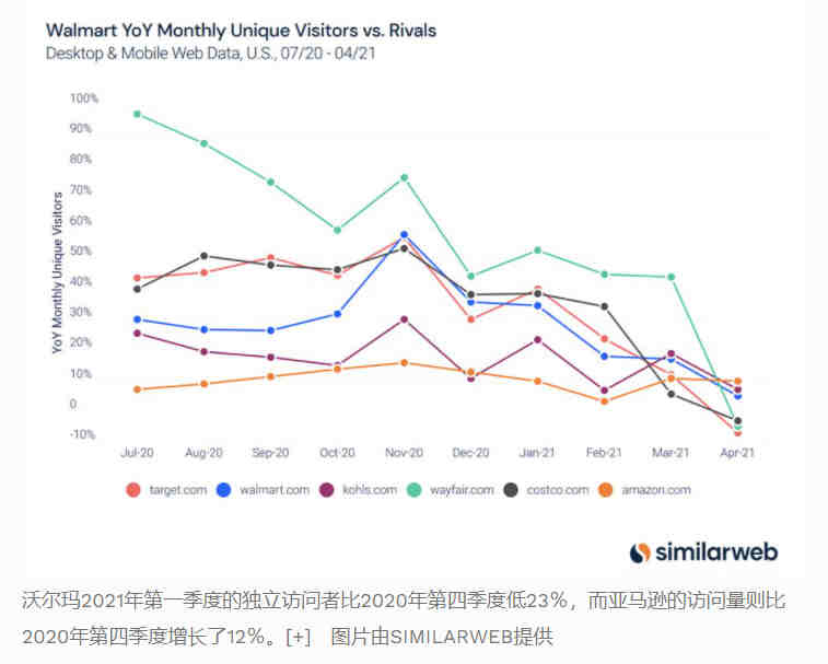 沃尔玛电商增长放缓,将使其追赶上亚马逊的可能性降低。据沃尔玛透露:“在未来几个季度,当美国消费者失去刺激性支票时,客流量可能会减少。目前3月至4月的访问量下降了8%。”