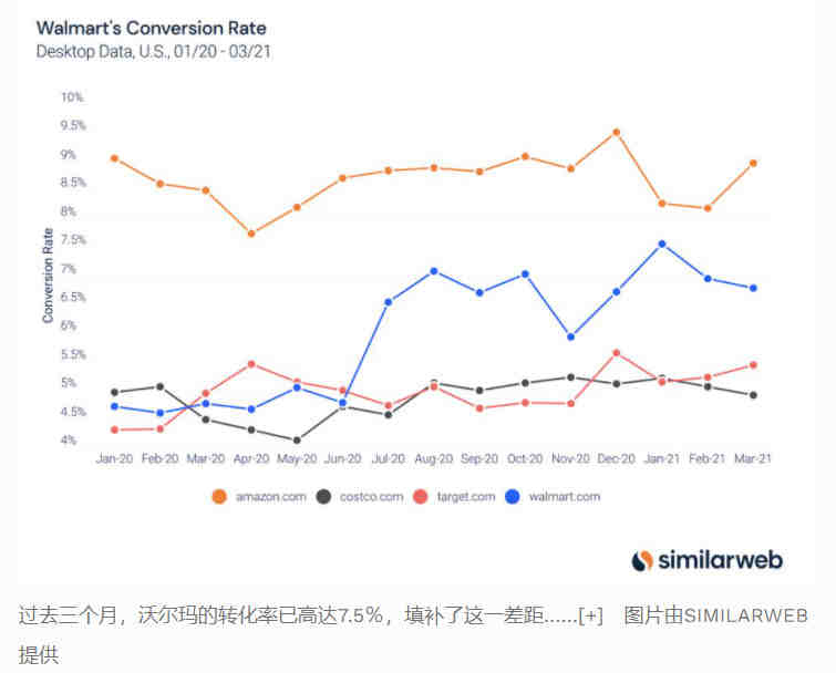 值得注意的是,沃尔玛的转化率达到了历史新高,甚至接近亚马逊。自2020年以来,亚马逊的转化率一直在7.5%和9.5%之间徘徊,沃尔玛则一直在5%以下。但在过去三个月里,沃尔玛的转化率增加到高达7.5%。