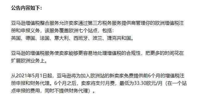 其网站发布公告:五月起,亚马逊欧洲站为新卖家提供免费的增值税注册申报和财务代理,活动持续6个月。该服务涵盖英国、德国、法国、意大利、西班牙、波兰、捷克共和国共7个站点。