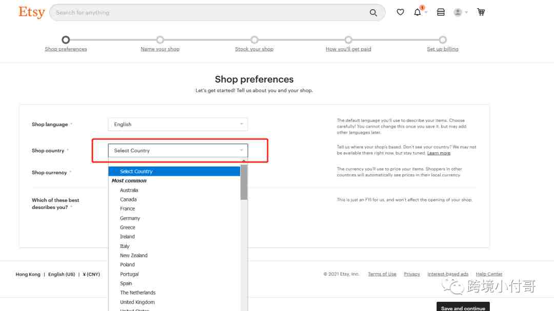 截止美国时间2021年4月26日,Etsy平台不接受不支持Etsy payments的国家和地区入驻Etsy平台了。我们到后台也可以看到之前之前有China的选项,现在也是没有了。