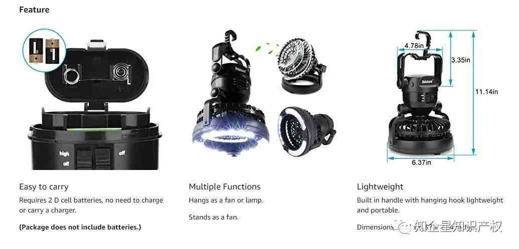 这款露营灯在亚马逊销售非常高,完美的解决了吹风和照明的问题,通过底部圆环支架设计,即实现了不同角度的照明,也可以当做桌面风扇使用,十分方便。