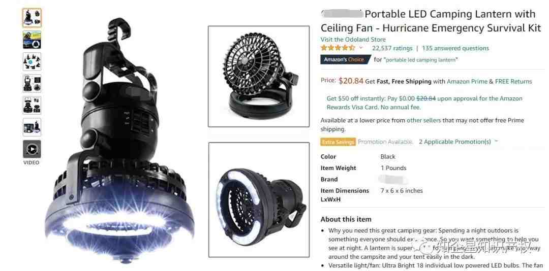今天在浏览亚马逊的时候,看到一款吊扇野营灯,它是亚马逊美国站的Amazon'sChoice 售价20.84美金,22537颗星。