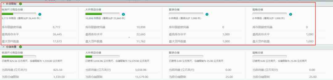 小伙伴么们可以通过库存绩效或货件处理进度,查看仓储类型级别的补货限制和使用情况。