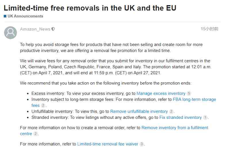 对于卖家在英国、德国、波兰,捷克共和国、法国、西班牙和意大利的运营中心提交的任何库存移除订单,亚马逊将免除移除订单费用。