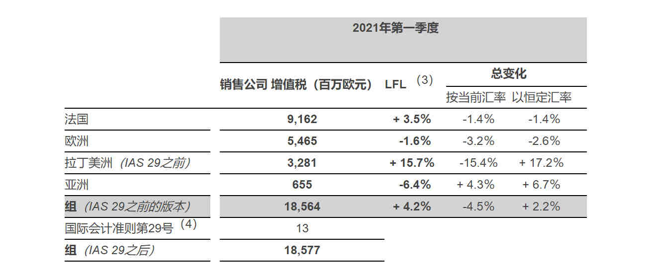 以下是2021年第一季度家乐福全球具体业绩:
