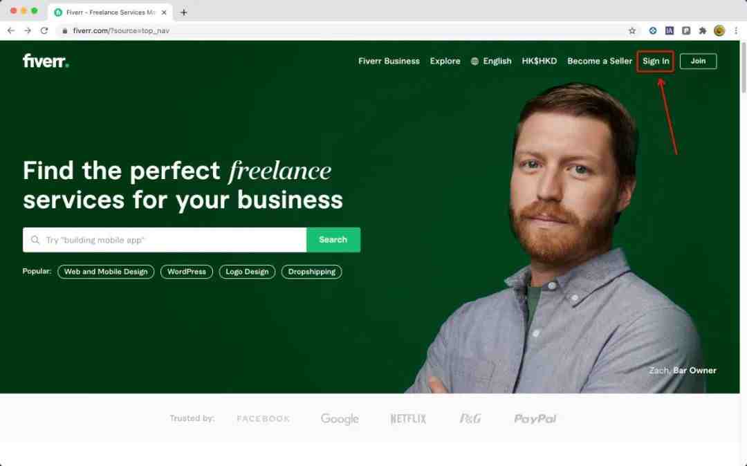 1.在您访问 www.fiverr.com 后,请先点击右上方的 Sign In 注册