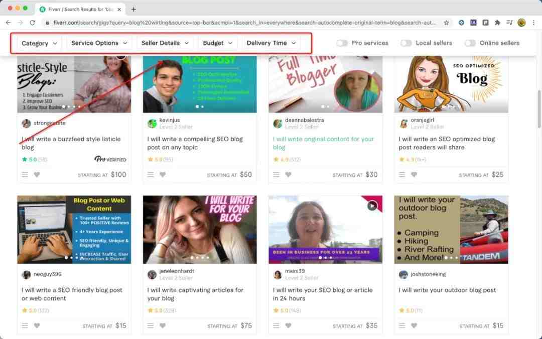 3.比如说您想要需要博客文章写作服务,在搜索 blog writing 后,相关的结果会出现在搜索结果页上