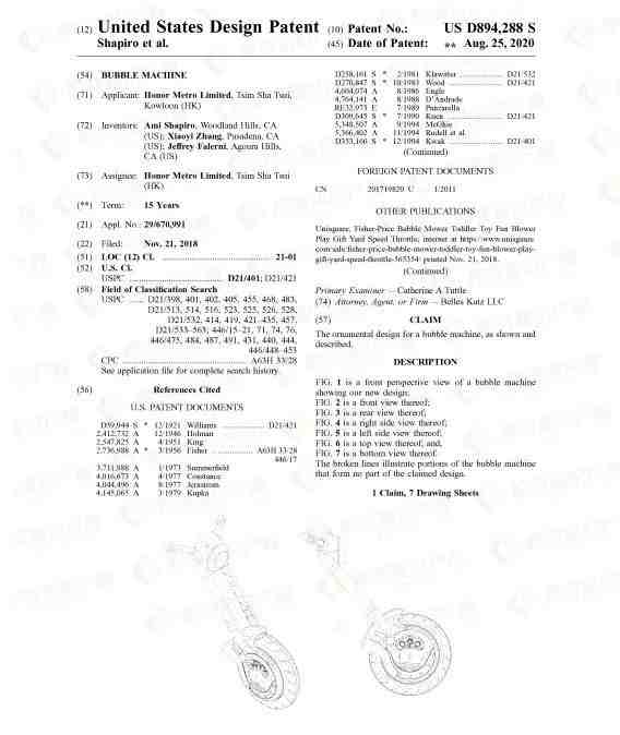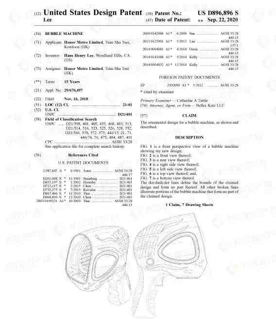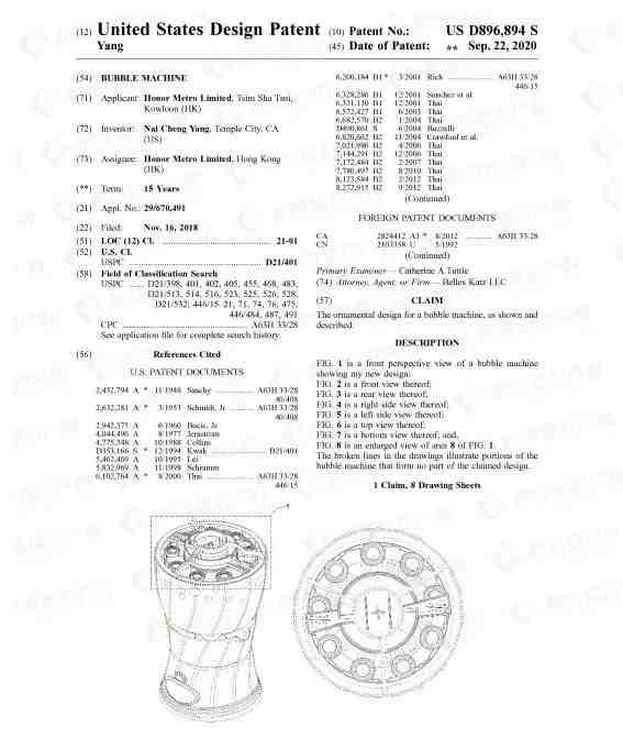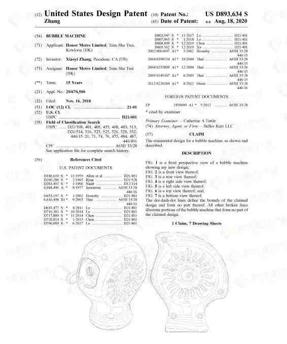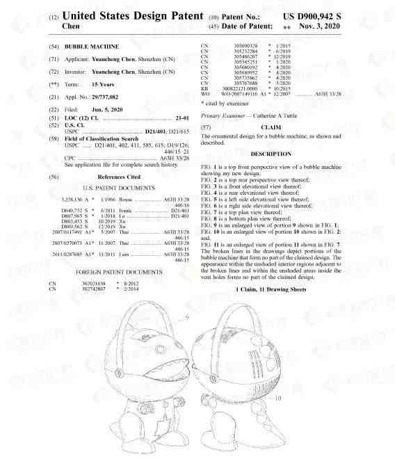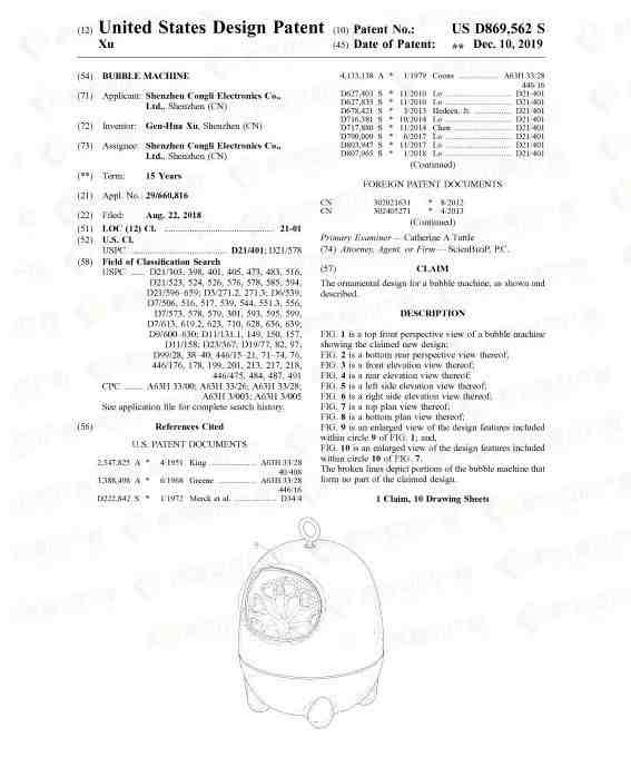 检索发现,泡泡机的外观专利很多,亚马逊上不少在售产品都已申请,侵权风险极高!检索到的部分外观专利: