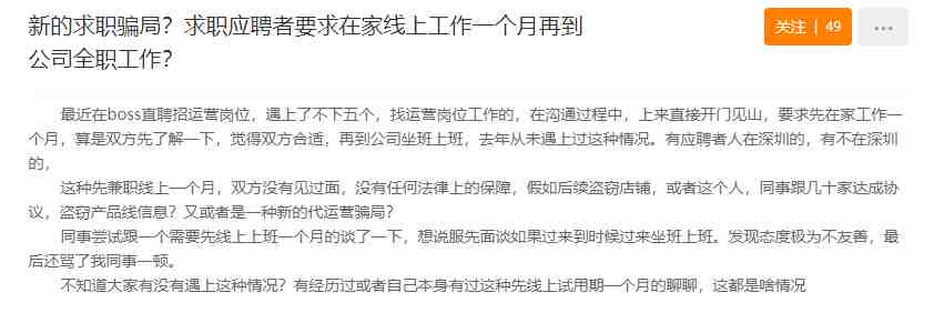 最近在boss直聘招运营岗位,遇上了不下五个求职者。在沟通过程中,上来直接开门见山,要求先在家工作一个月,算是双方先了解一下,觉得合适,再到公司坐班。应聘者中,有人在深圳的,有不在深圳的。