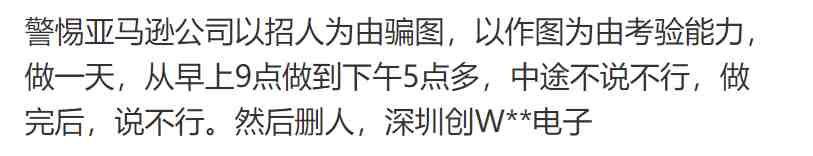 上个月,我遇到的一家亚马逊公司,以作图为由考验能力,作一天,从早上9点到下午5点多,中途不说不行,完成后,说不行,然后删人。这不就是以招聘为幌子,骗取我的图吗?