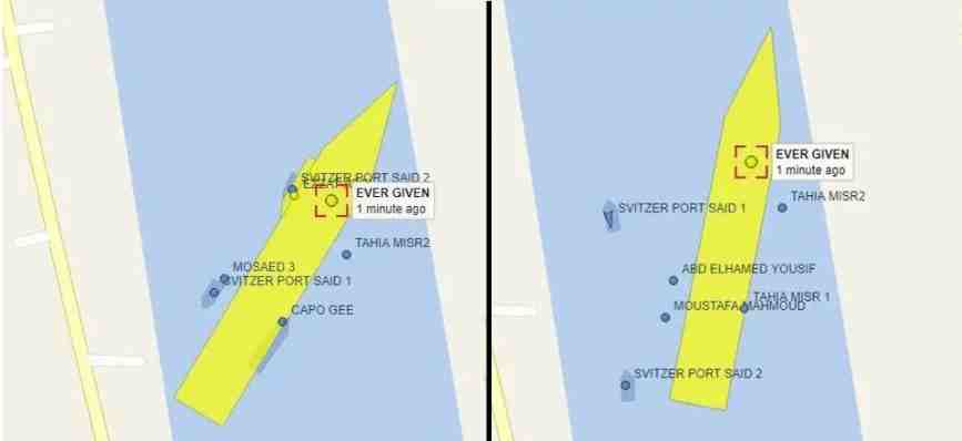 3月29日,苏伊士运河搁浅巨轮重新漂浮,目前正被摆正船身。画面显示,“长赐号”船尾大幅“摆动”,释放被堵住的航道。