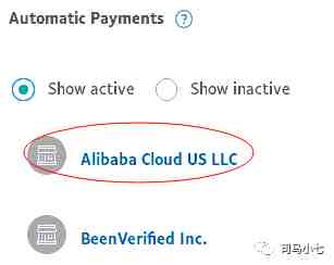 注册成功以后,在PayPal的Automatic Payments列表里可以看到Alibaba Cloud US LLC以及之前开通试用的BeenVerified Inc,如图: