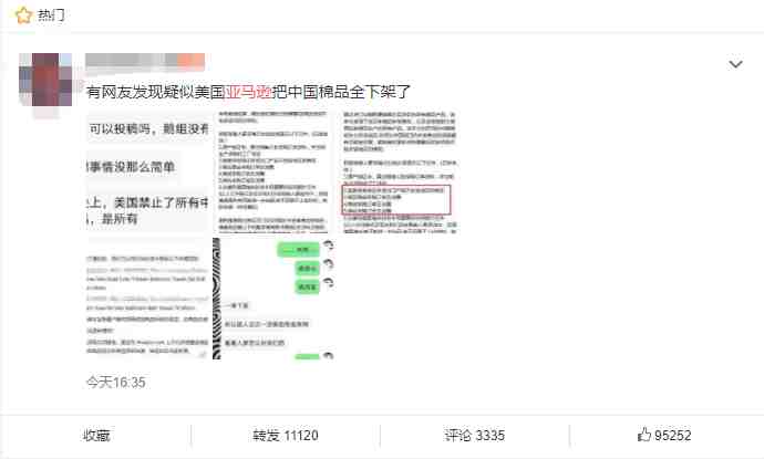 今天下午,微博上的一则博文引起了网民的广泛关注,“有网友发现疑似美国亚马逊把中国棉品全下架了。”