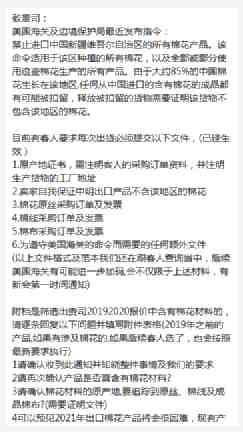 此外,还有一张截图也在卖家交流群中广为流传,内容为上海、江苏、浙江等地纺织及服装外贸公司都收到的美国采购商的通知,要求他们“不要用新疆棉花”,其订单中的服装、纺织品不得含有“任何新疆棉花成分”。