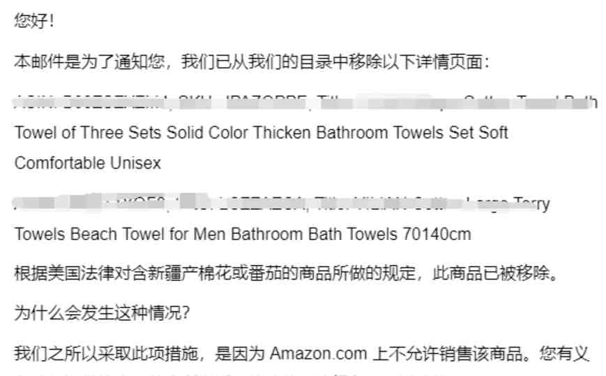 截图邮件显示:根据美国法律对含新疆棉花或番茄的商品所做的规定,此商品已被移除。我们之所以采取此项措施,是因为亚马逊上不允许销售该商品。