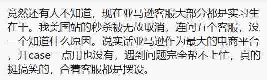 “现在亚马逊客服大部分都是实习生在干,开case一点用也没有,遇到问题完全帮不上忙,合着客服都是摆设。”