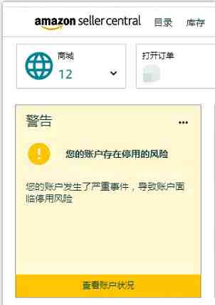 如果被亚马逊检测到了操作评论的话,亚马逊会先来封绩效通知,然后这个时候你就能看到后台有黄色危险警示,如下图所示,这个时候一般会有绩效团队给你来电话,跟你详细说明需要怎么写,并要求在72小时之内提交上去,过时间了就会直接关闭店铺。