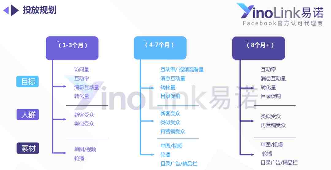 做facebook广告推广时,在不同的阶段,要针对性的选择广告目标,这样你的Facebook广告账户才能更好积累数据,机器才能更好达成广告目标,YinoLink易诺首席优化师 Nicole 给大家总结了在不同阶段应该选择怎样的广告目标、广告受众、广告素材,希望这个投放规划也能帮到各位卖家朋友。