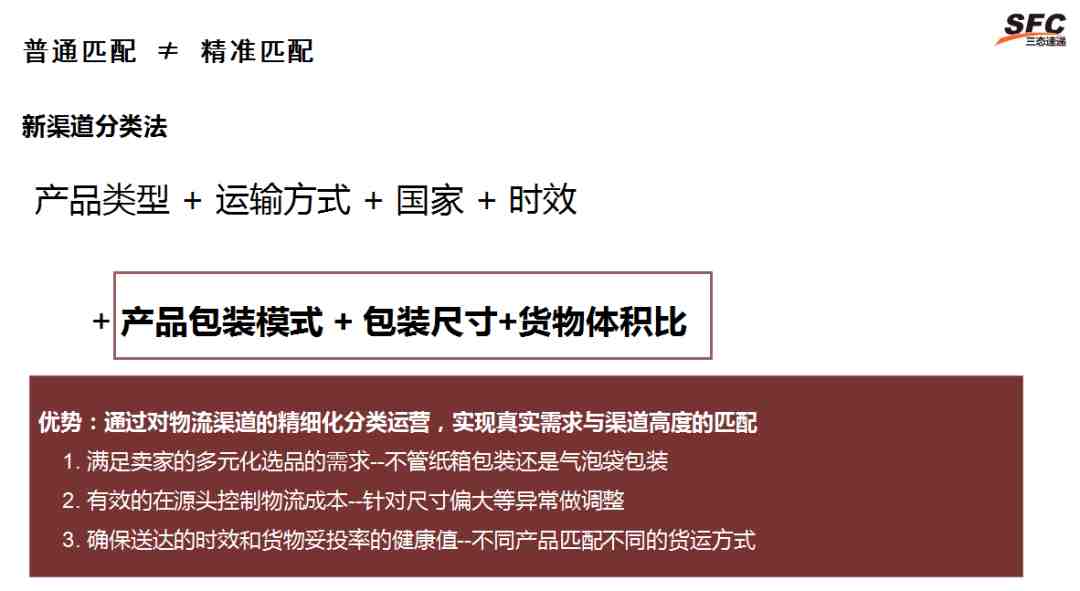 他还指出,独立站物流存在申报不合理、妥投率低而导致售后成本增加等问题,三态速递的业务经理Evan分享了物流的新渠道分类法,新渠道分类法:产品类型 + 运输方式 + 国家 + 时效,通过对物流渠道的精细化分类运营,实现真实需求与渠道高度的匹配。
