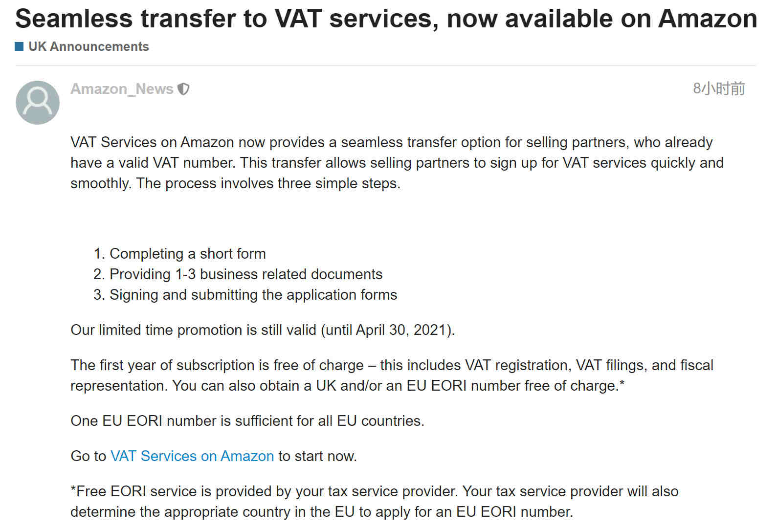 卖方通了解到,亚马逊为订阅该服务的卖家免除第一年订阅费,订阅服务包括增值税登记、增值税申报和财政代理。卖家还可以免费获得一个英国/欧盟EORI号码*。其中欧盟EORI号码足以满足所有欧盟国家的增值税EORI号码要求。