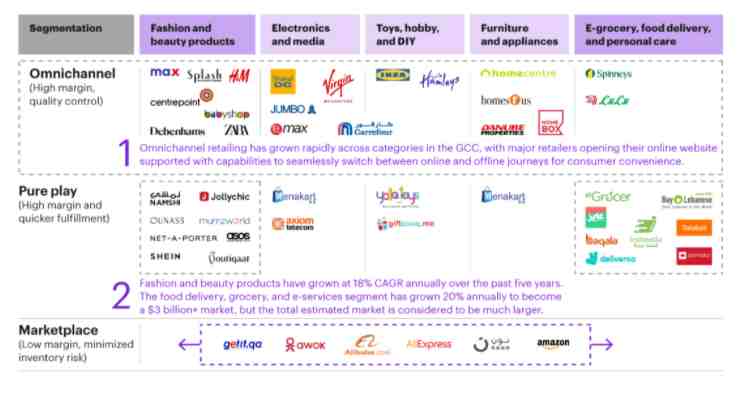 根据B2C电子商务在阿联酋的零售总额中所占份额是其中东邻国(如沙特阿拉伯,卡塔尔和阿曼)中最高的,但远低于成熟的在线零售市场(如中国和英国)。根据新的yStats.com报告,在COVID-19爆发期间,沙特阿拉伯“家庭娱乐”和“消费电子”产品的在线购买量猛增。此外,杂货和食品的在线订单激增。中东零售电商Noon和亚马逊中东站在电子商务销售中所占份额超过50%,处于头等位置。得益于他们的运营投入和出色的客户服务。如下图: