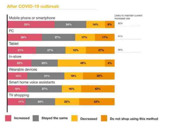 根据PwC最近的《全球消费者洞察调查》COVID-19 Pulse调查(于2020年5月进行),中东受访者中有53%的人增加了使用智能手机购物的比例,而在所有地区中,这一比例为34%。同时,调查称有39%的人通过计算机增加了购物,其中31%的人更频繁地使用平板电脑进行购买。这些结果不足为奇,因为许多消费者可能由于在家工作或只是浏览打发时间而使用了多种设备。同样不足为奇的是,有49%的受访者表示他们减少了店内购物。如下图: