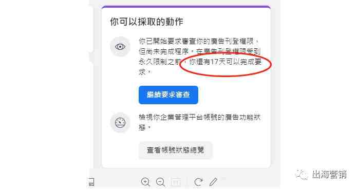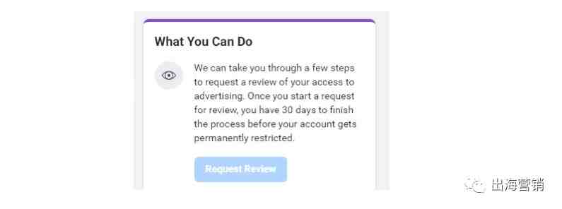 1.单击“帐户品质”里的“请求审核”按钮提交审核 ,Facebook客服表示,这是唯一的申诉入口。不过我发现这一块有进步,可能是因为前两周被屏蔽的个人号太多了。Facebook紧急优化了按钮上的一段话:可以在30天内提交审核,超过30天广告将被永久限制。