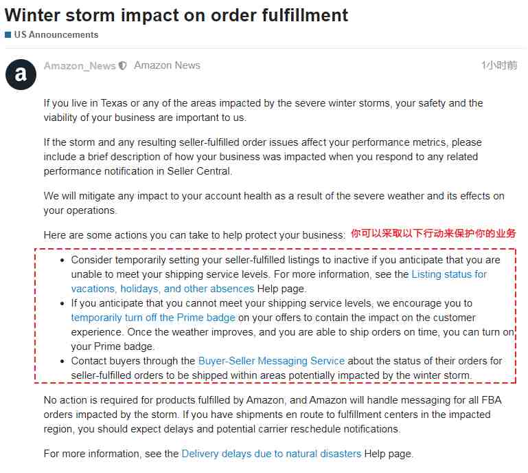2月19日,亚马逊在卖家论坛发布了有关自然灾害对物流配送影响的相关通知,具体内容如下: