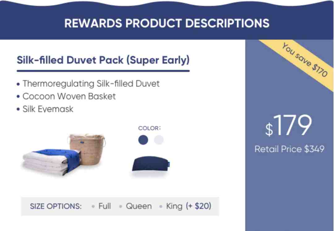 在众筹套餐中,一张被子+一个编织篮+一个丝质眼罩,售价为179美金,而零售价则要349美金。
