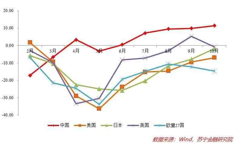 根据Wind数据的显示,从2020年Q3开始,中国货物出口同比呈增长态势,而美国、英国、日本和欧盟等经济体的出口仍不能彻底摆脱疫情的困扰。由于中国经济率先走出泥潭,且产能持续复苏,全球订单中的相当一部分涌向了中国,进而带动了出口的增长。从海关总署公布的数据统计可以看出,2020年1-10月份,我国的机电产品、纺织品、塑料制品和家具的出口均取得不错的成绩,累计同比增速分别为3.8%、34.8%、18%和7.9%。