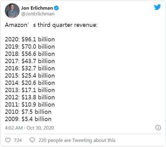 从亚马逊的财报中我们可以看到,2020年的第三季度亚马逊的营收有961亿美元,与2019年第三季度的700亿美元相比,增幅达到37.3%,而其中的在线商店净销售额为483.5亿美元,同比增长38%,占总净销售额的一半。足以表明海外各国的消费者因疫情原因,更多的将消费诉求转至线上,从而形成了线上消费的习惯。statista的公开数据也表明,2020年以来,Amazon.com的访问量在9月份达到24.37亿次,较去年同期增长了18.4%,且一直呈持续上升的趋势。