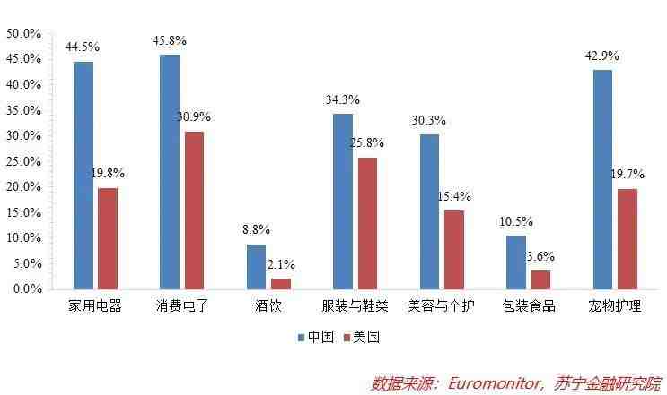 根据Euromonitor的统计数据,以中美两国为例来加以对比,2019年中国在家用电器、消费电子、酒饮、服装与鞋类、美容与个护、包装食品、宠物护理多个领域的电商渗透率均显著高于美国(见下图),而差距的另一面,恰恰是提升空间的客观存在。
