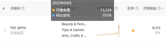 通过上方搜索栏可以看出,“hairgems”在4月份搜索量最高,达到了1.3万,虽然在5月份有所下降,但是随着6月份TikTok大量视频火爆,搜索相比五月会增加一些。